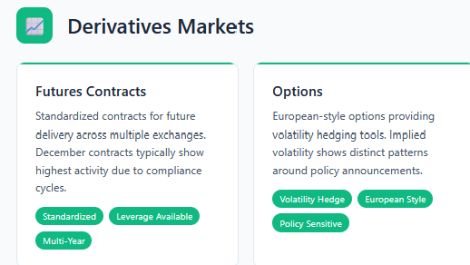 These instruments require modelling the forward curve under various regulatory scenarios (Regulatory announcements can move carbon prices 20-30% in a single day) while accounting for banking provisions, borrowing restrictions, and vintage-specific trading rules. The mathematics involve path-dependent payoffs where current decisions affect future option availability.